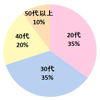 20代と30代で全体の7割を占めており、若年層から働き盛りの世代まで幅広く支持されているのがわかります。40代以上の方も3割いらっしゃるので、大人の女性も通いやすい落ち着いた環境と言えそうですね。