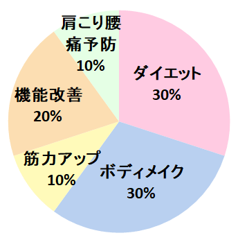 ダイエットとボディメイクを合わせて6割にのぼることから、「理想の体型に近づきたい」という高い意識を持つ方が中心と言えます。