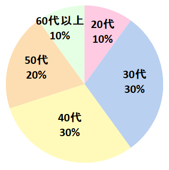 30〜40代が中心ですが、20代から60代以上まで幅広い年代が在籍。世代を問わず通いやすい構成です。
