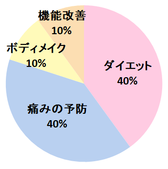 ダイエットと痛みの予防がそれぞれ4割と中心。見た目の変化だけでなく、健康維持や将来の不調予防を目的とする方が多いことが分かります。
