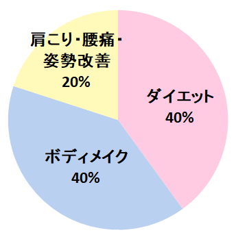 ダイエットやボディメイクを目的とされる方が中心で、姿勢改善や肩こり・腰痛改善を目的に通われている方もいらっしゃいます。