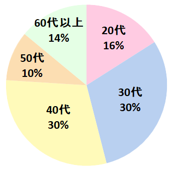 30代と40代がそれぞれ約3割を占めており、全体の約6割が働き盛りの世代です。次いで20代が1.6割、50代が1割、60代以上が1.4割と、若年層からシニア層まで非常に幅広い層が利用しています。