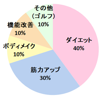 ダイエット目的が4割と最も多く、次いで筋力アップや運動習慣づくりが3割を占めています。ボディメイク、機能改善、さらにはゴルフのパフォーマンス向上といった専門的な目的もそれぞれ1割ずつあり、個々の幅広いニーズに柔軟に対応していることが伺えます。