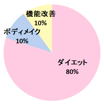 利用者の8割がダイエットを目的としており、減量やシェイプアップに強いこだわりを持つ方が集まっています。残りの2割もボディメイクや機能改善が目的であり、単に痩せるだけでなく「見た目の美しさ」や「体の動かしやすさ」を追求する層に支持されています。
