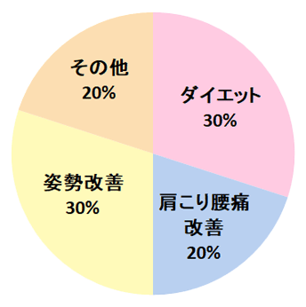 ダイエットや姿勢改善を目的とする方が多く、肩こりや腰痛など体の不調改善で通う方も見られます。