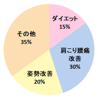 肩こり・腰痛の改善が最も多く3割を占め、次いで運動不足解消やリハビリなどの目的が続きます。身体の不調を整えるために通う人が多い傾向です。