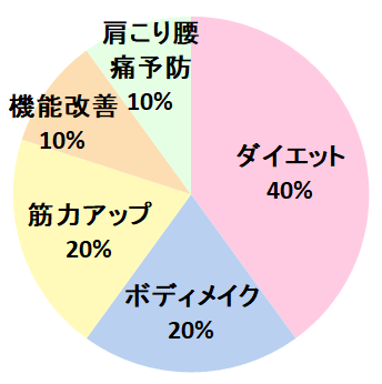 ダイエット目的が一番多いものの、ボディメイクや筋力アップ、さらには体の機能改善や痛み予防など、健康的な体づくりを目的とされる方も半数以上いらっしゃいます。単に痩せるだけでなく、長期的な健康維持を目指す方にも支持されています。